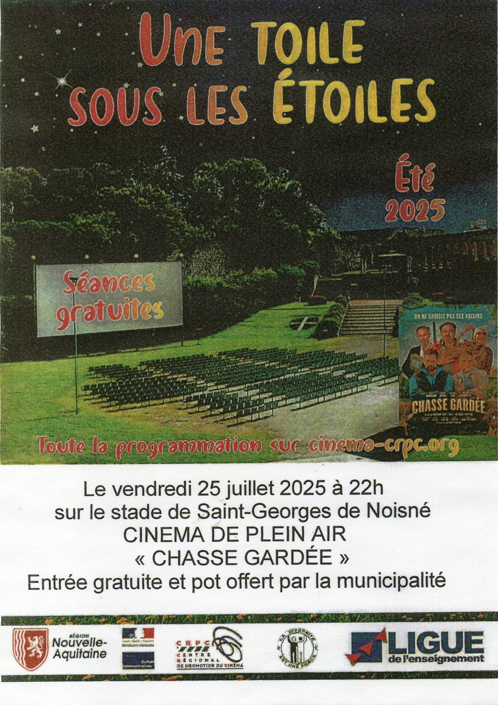 La municipalité vous invite gratuitement pour son cinéma de plein air le vendredi 25 juillet à partir de 22 heures sur le stade de Saint-Georges de Noisné.